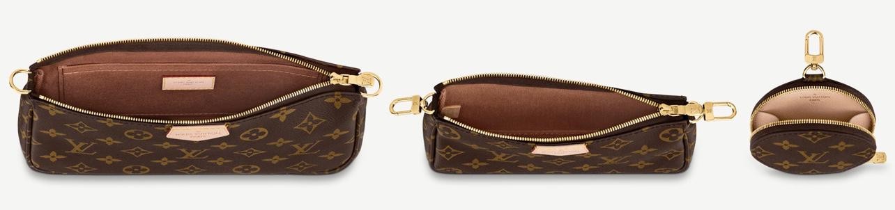The latest 3 in 1 brown clutch/purse by LV is a cross body bag with several pockets and compartments, including a round coin purse. It has a detachable gold-tone chain strap and an adjustable belt for various carrying options imprinted with the logo on it.