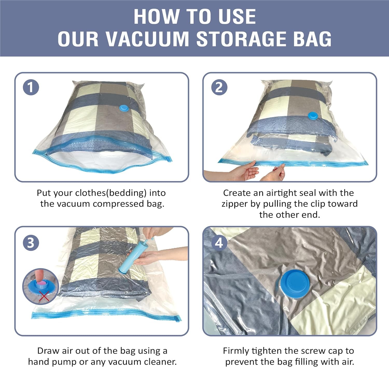 Come with extra large storage capacity, our jumbo vacuum storage bags is the go-to solution for high loads of seasonal cloth storage, house space saving organization, and travel necessities. Use our XXL space saver bags and store away variety size items including bedding, clothes, blankets, pillows, plush toys, and more. What's more: you can use our compression bags to reduce larger and fluffier items such as vests and winter coats to minimal sizes with ease. Our jumbo vacuum storage bags are tailored to pack hefty item such as big quilts, bedding or blankets.
