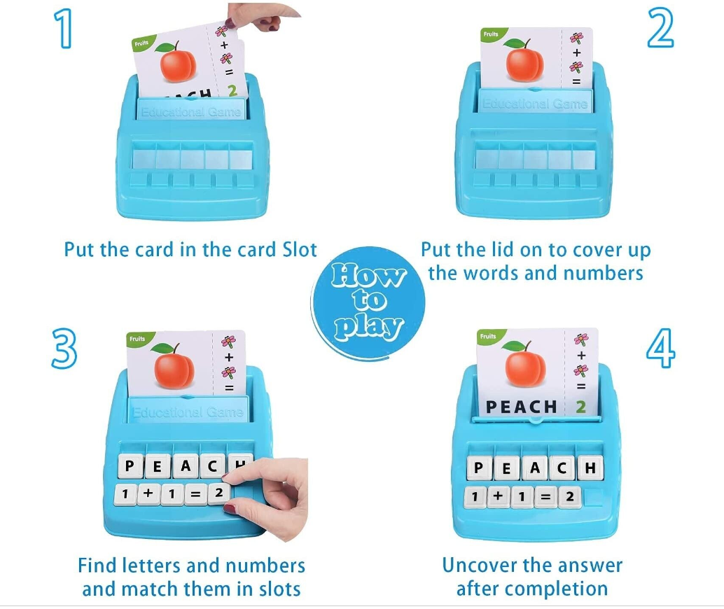 • 1.2-in-1 Spelling & Counting Educational Toys - Each card shows a picture of an object which kids are familiar with and arithmetic operation. Put the card in the card holder, kids need to find the right letters/numbers and put the letter/number cubes on the letter/number holders to complete the matching letter game.