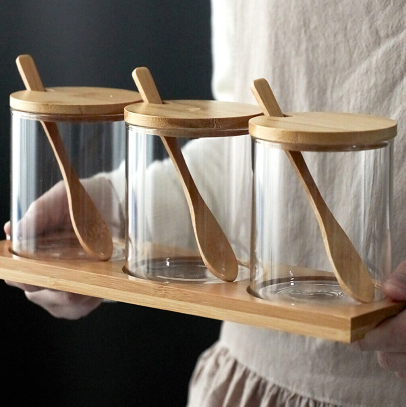 This spice Jars set are made from glass and bamboo.
