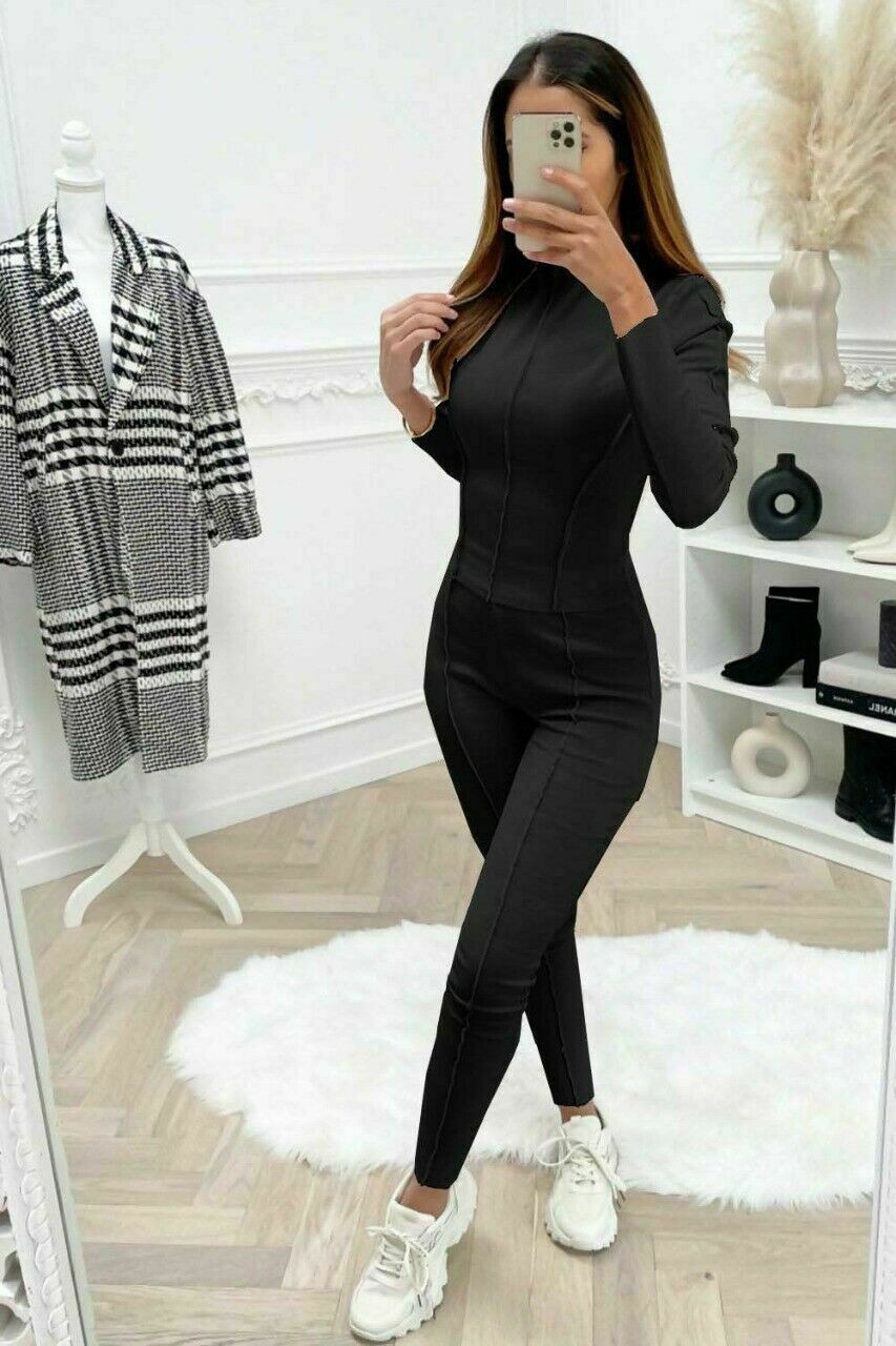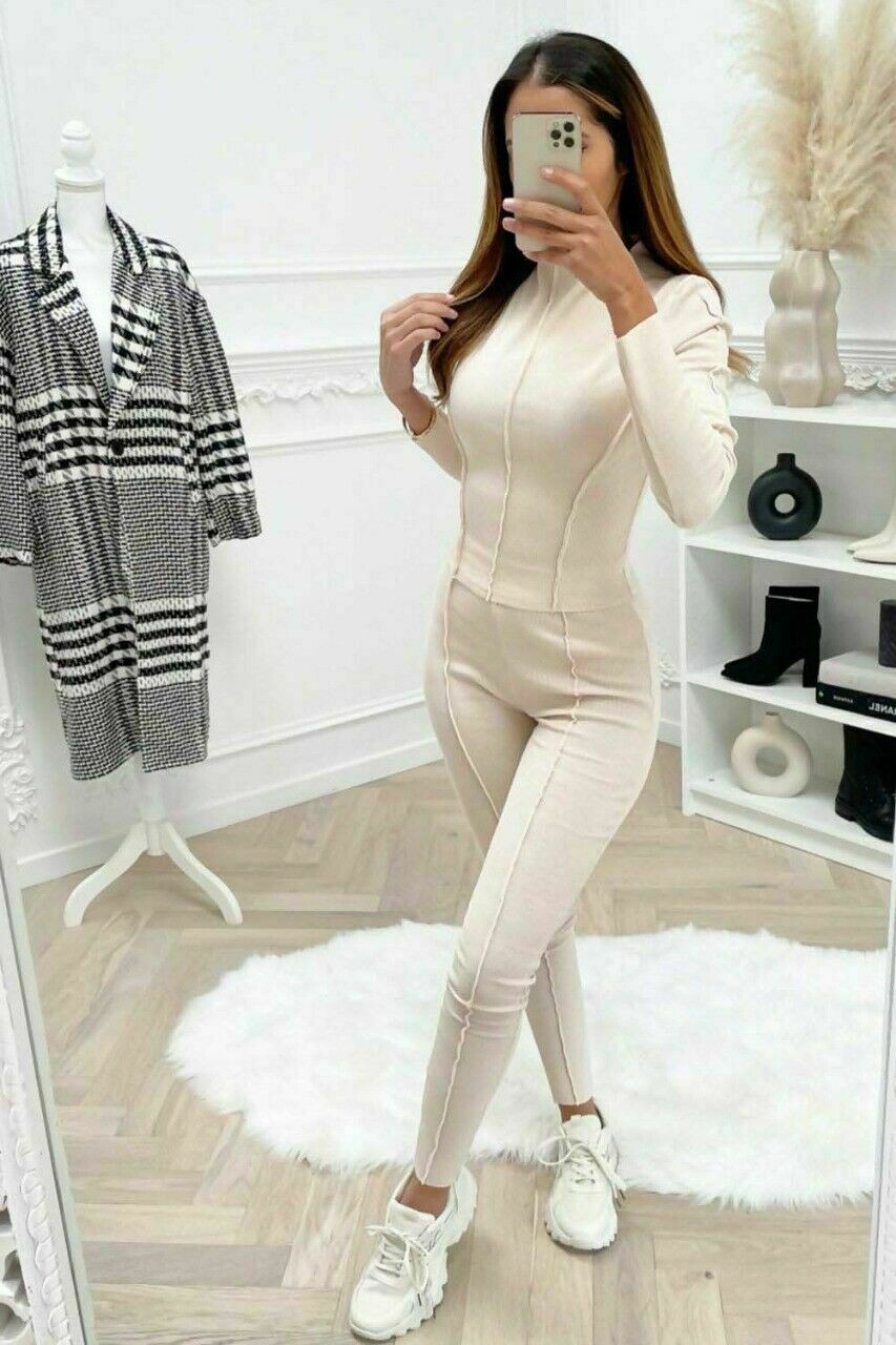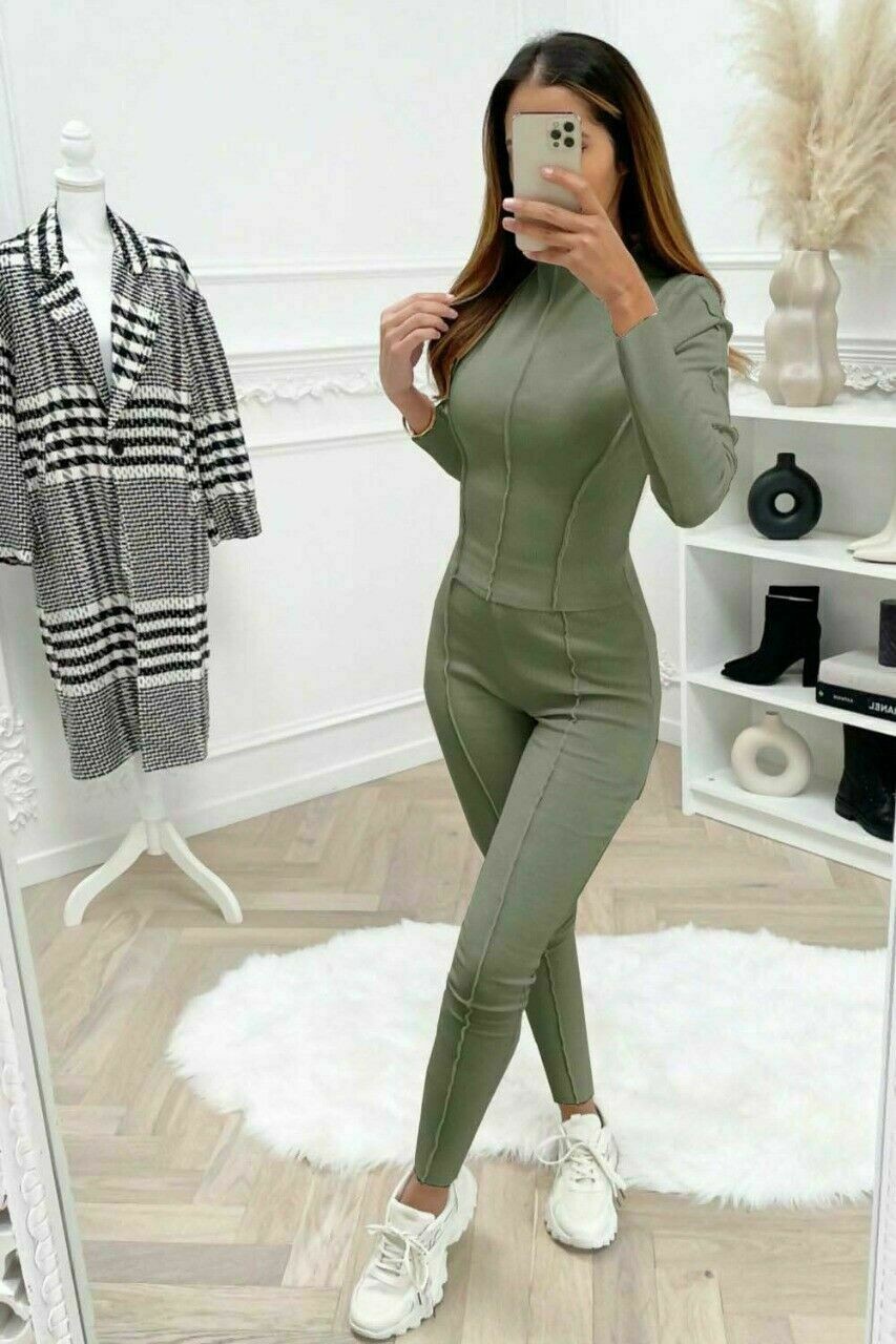 Ladies Womens Overlock Ribbed Top Leggings 2 piece Loungewear Tracksuit Set