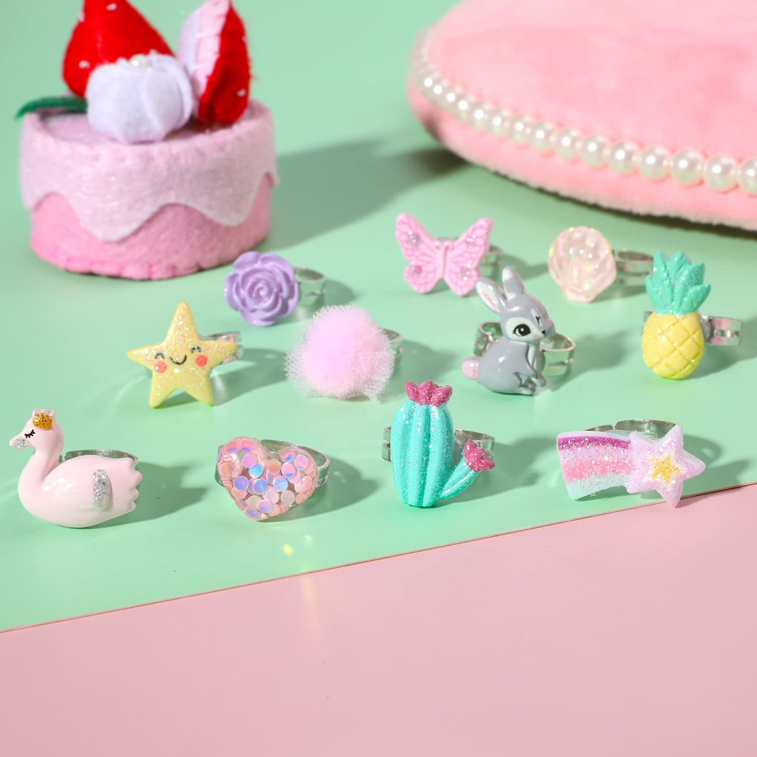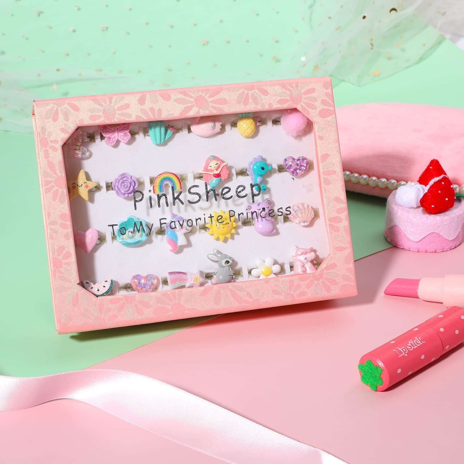 PinkSheep Little Girl Jewel Rings in Box, Adjustable, No Duplication, Girl Play