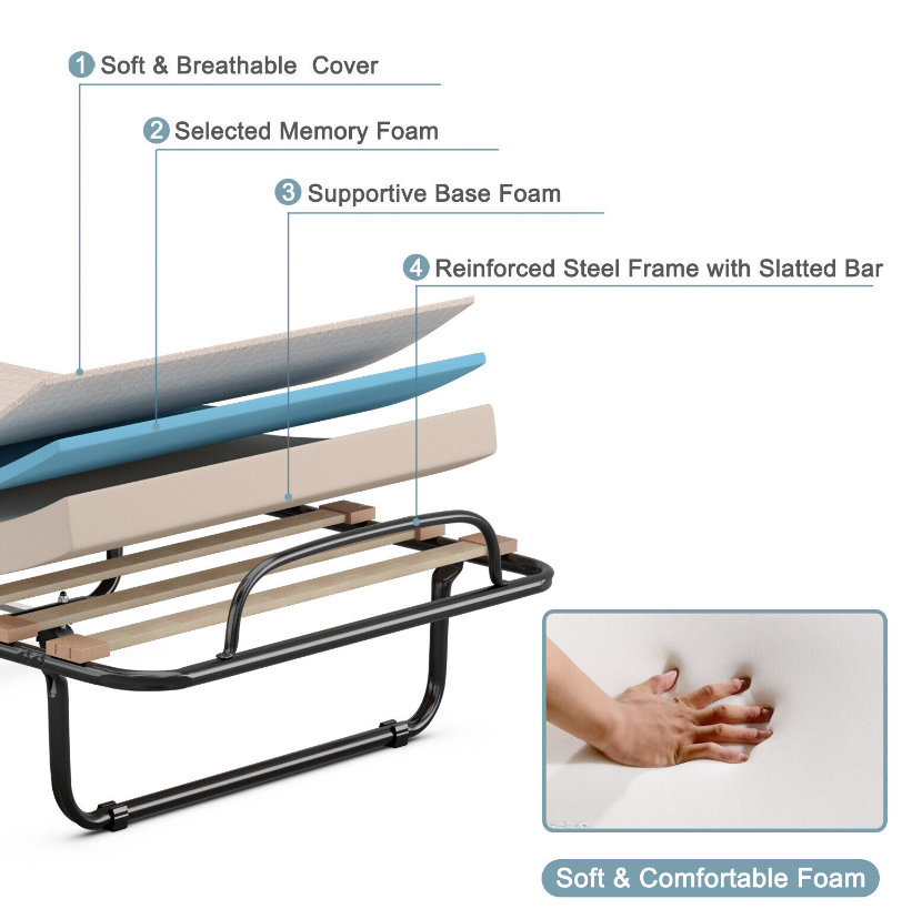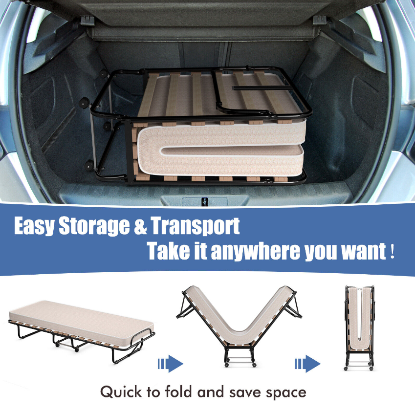 Description: Our folding beds provide you ultimate sleep experience! With high soft and high quality foam mattress, this folding bed gives you a cozy and comfortable feeling when you are lying. The study metal construction with dense slatted bar is strong enough to withstand maximum load-bearing capacity of 265 pounds. What's more, this bed is perfect for limited space due to its folding design. And the all-directional wheels allow you to move and store it anywhere. It can be placed in the living room, bedroom, office, study room and more places. Enjoy your leisure time with this upholstered bed!