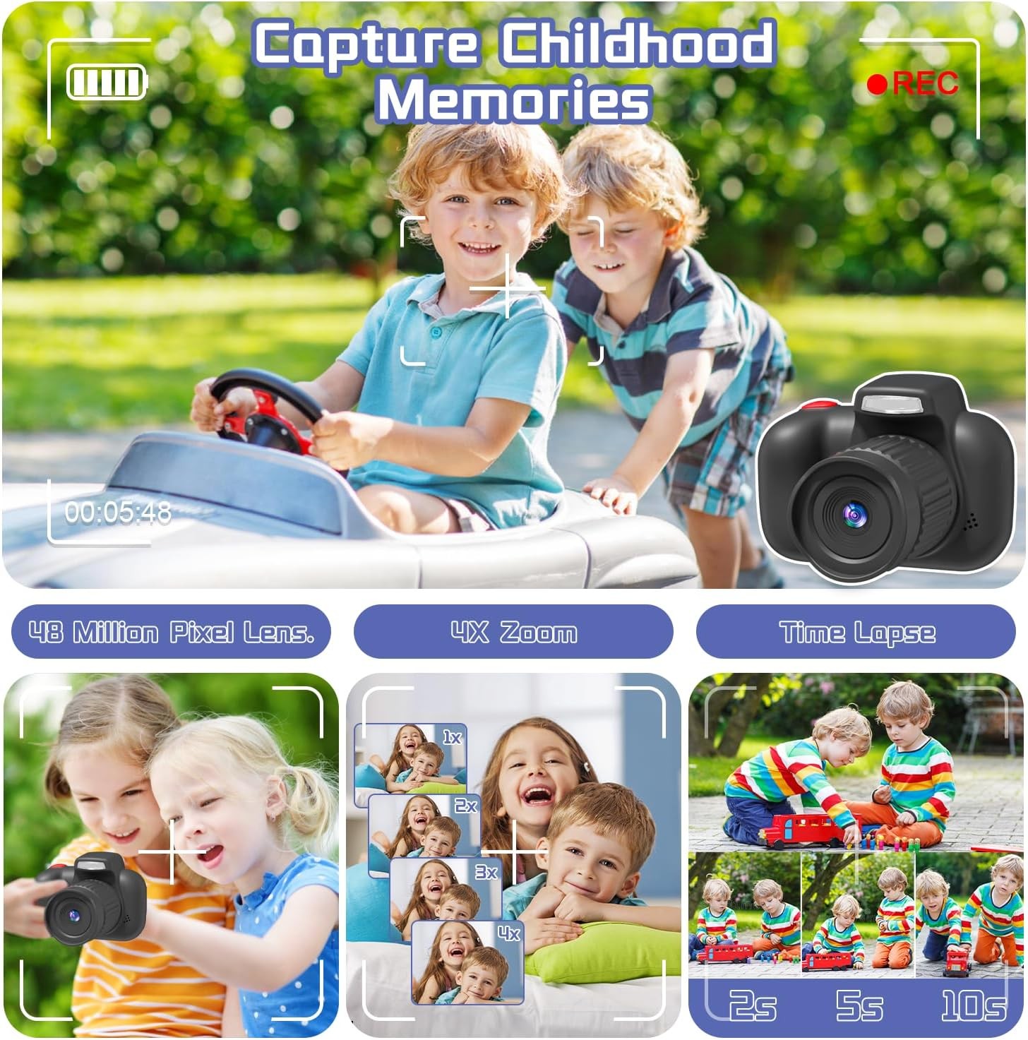 • ??【HD Kids Digital Camera】Children Camera is Equipped With A High-quality Auto Focus And 48m Megapixels Lens, Supports 720p, HD 1080P Video Recording, Greatly Improves The Quality Of Photos And Videos, Also Can Help Kids Capture Life's Beautiful Scenes, Some Hilarious Photos, And Wonderful Moments With Friends And Family.