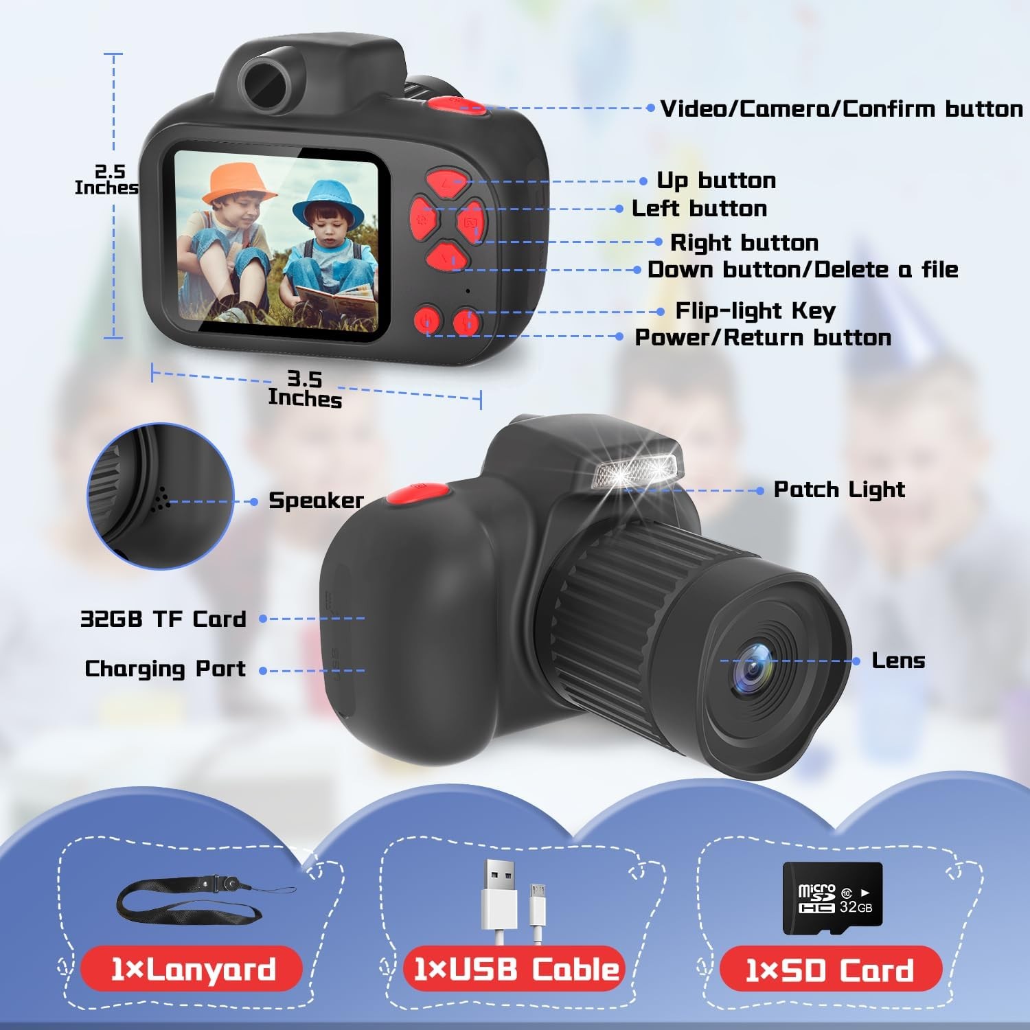 • ??【Multi-Scene Selections】This Kids camera for boys girls age 3 4 5 6 7 8 9 10 11 12 year old Is Equipped With 6 Color Filter Effects and 30 Cartoon Photo Frames. With A Big Head Sticker And Cartoon Frames, Boys And Girls Can Start Capturing The World Around Them Create Interesting Life Photos And Record Memorable Moments. With A 32GB Memory TF Card, Which Makes It Possible To Store About 5000 Photos Or Hundreds Of Videos. Children Can Take Photos With Their Own Camera, Giving Them A Sense Of Accomplishment!