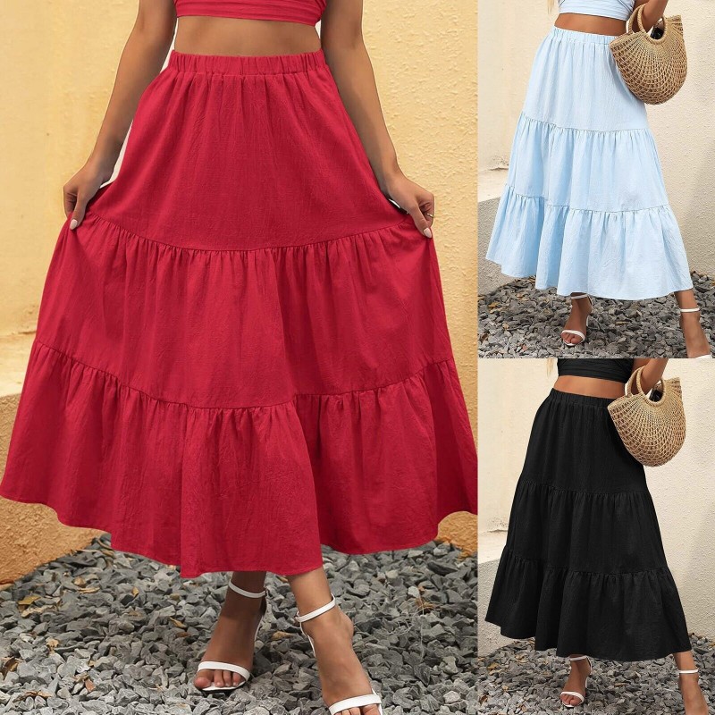 Women Boho Elastic Waist Pleated A-Line Flowy Swing Tiered Long Skirt Dress